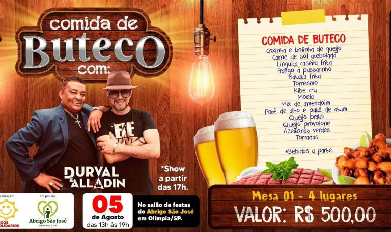 Neste sábado, dia 5 de agosto, das 13h às 19h, acontece a primeira edição do evento Comida de Buteco, em prol ao Abrigo São José. Show especial com a dupla Durval e Alladin. A realização é do grupo Amigos Solidários. Compre sua mesa e participe desta grande festa solidária.