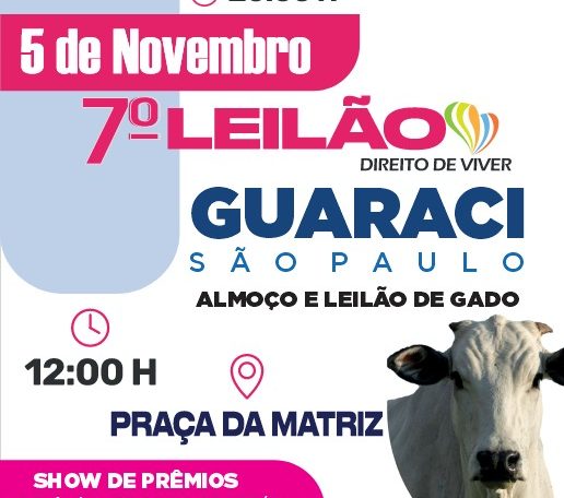 O SETIMO LEILÃO DIREITO DE VIVER acontece no município de Guaraci, nos dias 3 e 4 de novembro com grande QUERMESSE, a partir das 20hs, e no dia 5 ALMOÇO E LEILÃO DE GADO.