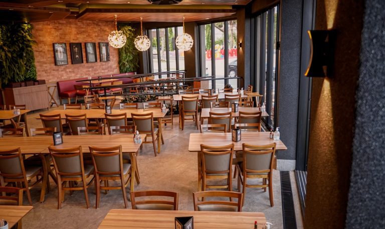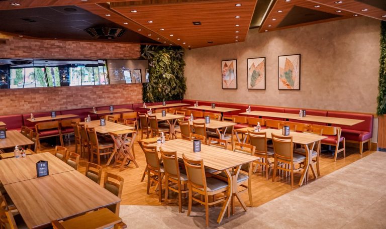 Um restaurante de cores vibrantes, iluminação sofisticada,  atmosfera aconchegante, ampla visibilidade e atendimento de altíssimo padrão.