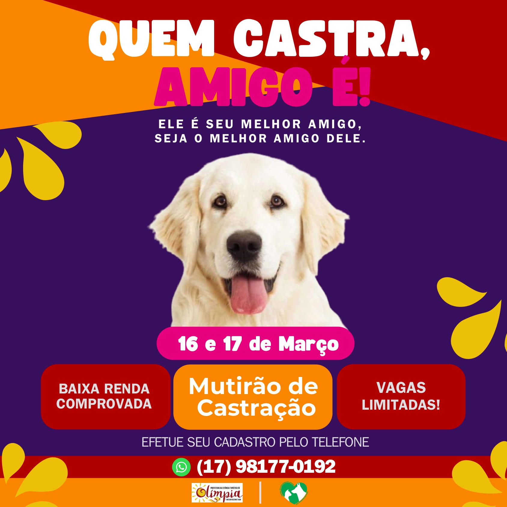 Para isso, o mutirão contará com o auxílio de um veículo Castramóvel, que será instalado na Praça, das 7h30 às 16h, nos dois dias da campanha (sábado e domingo), realizando as castrações. Para participar, é preciso realizar cadastro antecipado, no período de 27 de fevereiro a 08 de março, na secretaria de Zeladoria e Meio Ambiente ou pelo telefone e WhatsApp (17) 98177-0192, visto que as vagas são limitadas.