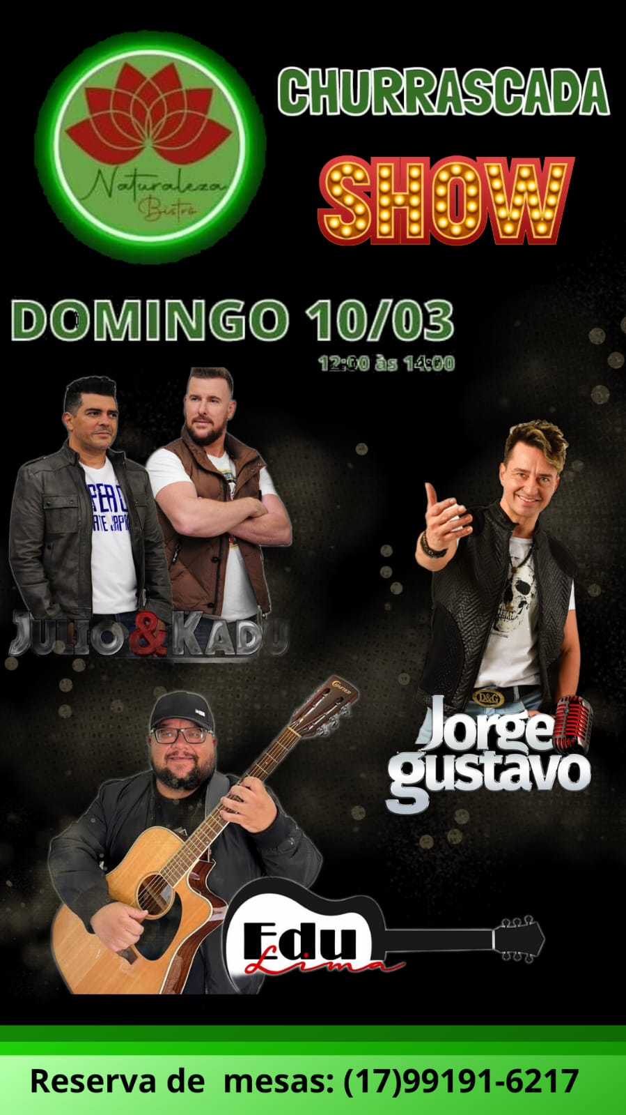 Um super cardápio comandado pela equipe Naturaleza Bistrô. E no comando do churrasco, o especialista chefe Oseas. Um evento diferenciado, com 6 horas de show, que espera por você!